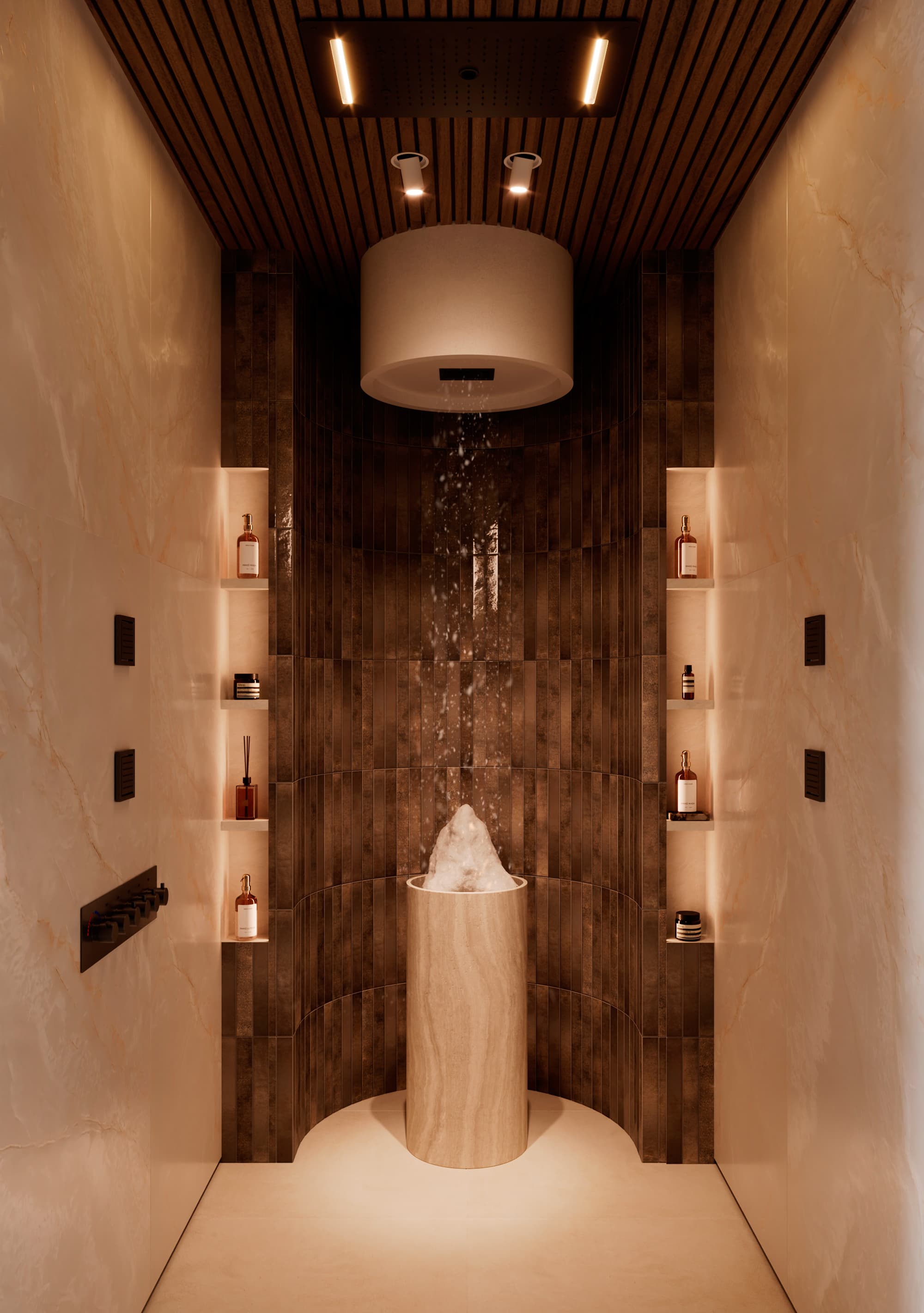 The immersive sensory shower is a modern element that combines various shower types, aromas, and lighting. It creates unique sensations and makes water treatments unforgettable. When designing such a shower, it is important to consider its accessibility and integration with other spa elements. - Snow Rooms